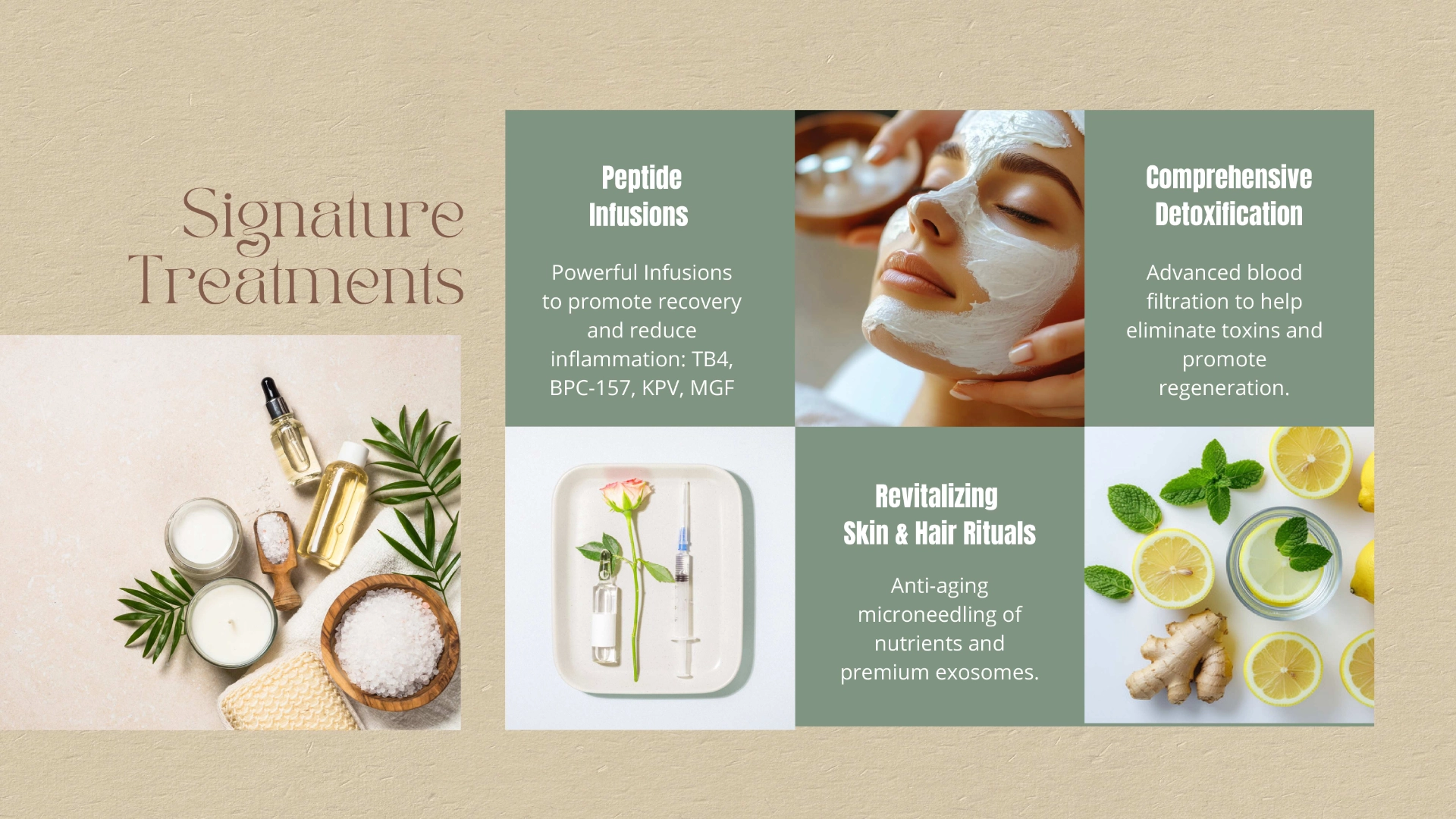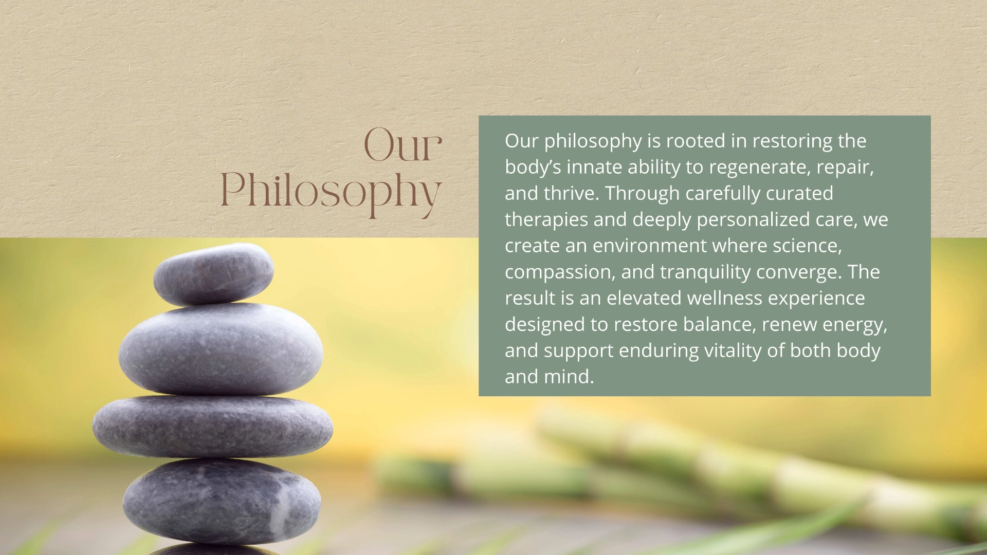 Through carefully curated therapies and deeply personalized care, we create an environment where science, compassion, and tranquility converge. The result is an elevated wellness experience designed to restore balance, renew energy, and support enduring vitality of both body and mind.