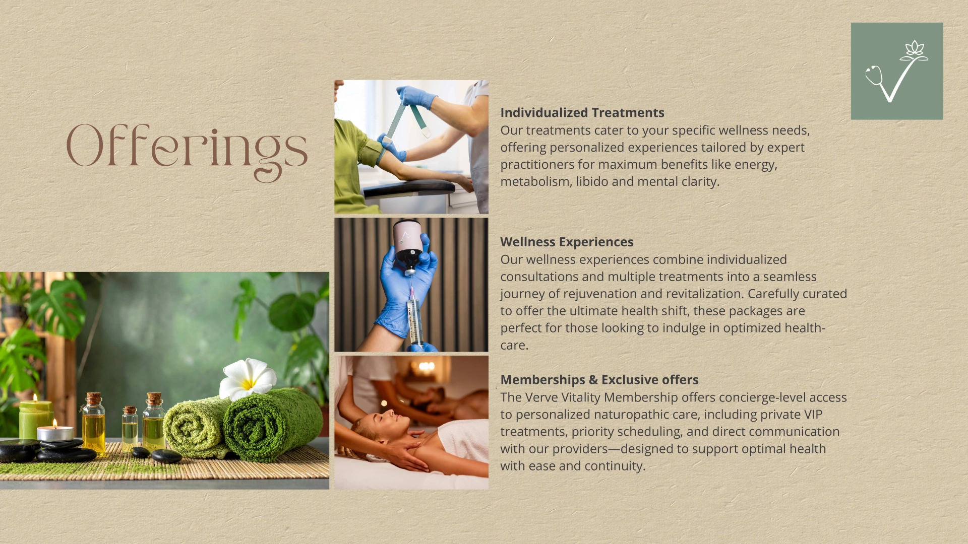 Each Verve Vitality experience focuses on a specific aspect of wellness and regeneration. Together, these offerings create a comprehensive pathway designed to help patients restore balance, improve cellular health, and support long-term vitality.