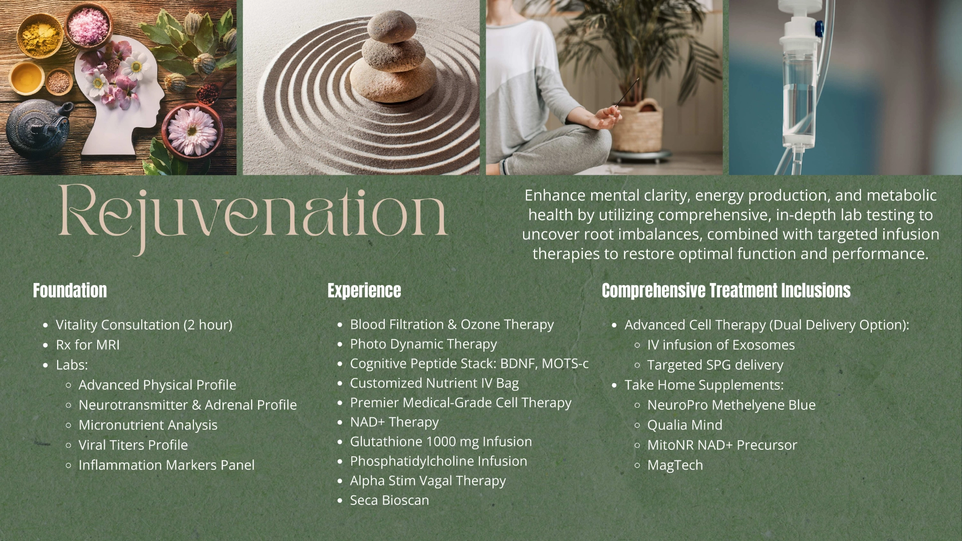 Renew mental clarity, restore vibrant energy, and support metabolic balance through advanced diagnostic insights and precision infusion therapies designed to revitalize the body at a cellular level.