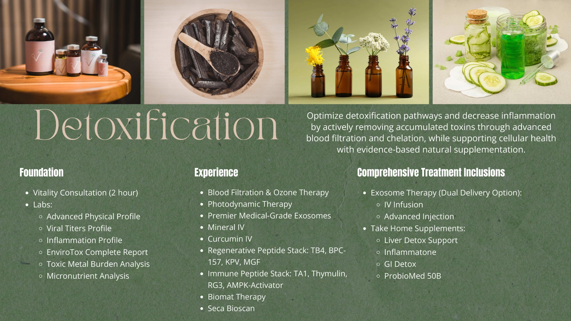 Purify and rebalance the body by reducing toxic burden and inflammation through advanced blood filtration therapies, chelation, and supportive detoxification protocols.