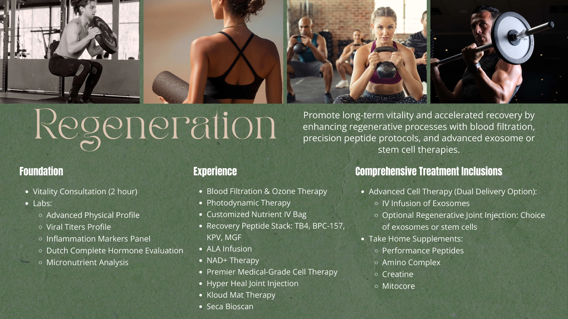 Support long-term vitality and accelerated recovery through advanced regenerative therapies, peptide optimization, and cellular repair strategies.